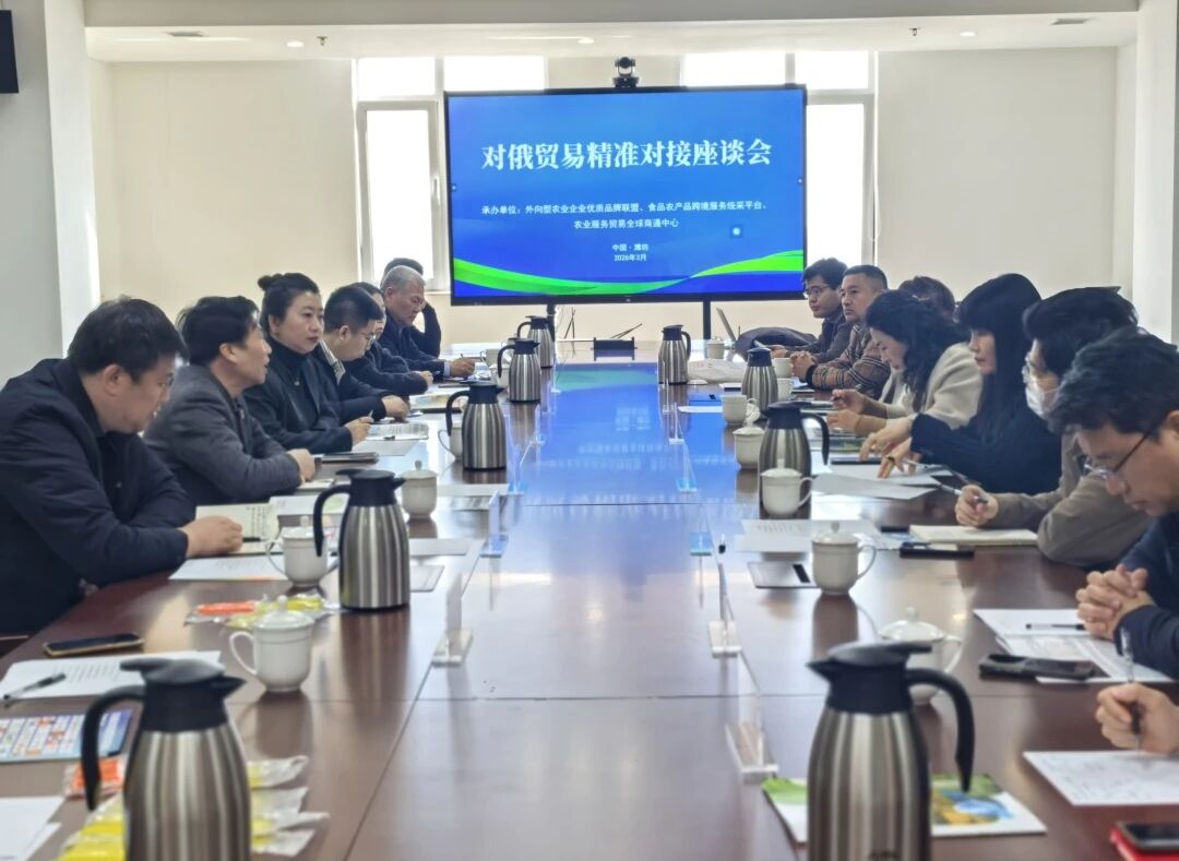 3月19日,对俄贸易精准对接座谈会在农业服务贸易全球商通中心举办。吉林省商务厅欧亚处处长李壮,吉林省新电商产业协会会长夏焱、秘书长李铭圻,吉林寰谷农业服务有限公司董事长石欣一行到访;潍坊农业开放发展集团有限公司总经理徐述兴、潍坊市食品协会副会长马丽,以及寿光市齐民要术研究会、以及盛安食品、华朔农业、盛华食品、万亩良田、创超农业等单位与企业代表参加对接洽谈,围绕对俄果蔬出口、跨境物流、渠道共建等事项开展精准对接、务实合作。