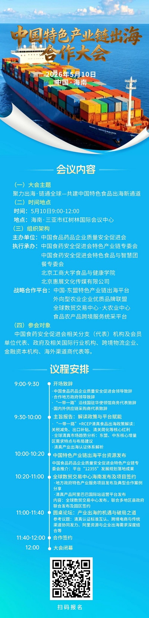 为全面贯彻落实党的二十届四中全会和习近平总书记关于食品药品产业新质生产力和高质量发展的一系列重要指示精神,在海南自贸港全岛正式封关运作和中国食品药品企业质量安全促进会成功举办“2025中国食品药品医疗器械化妆品新质生产力和高质量发展大会”的大背景下,中国食药安全促进会服务国家发展战略,见证封关取得的优异成绩,汇聚新质生产力资源与智慧,持续助力海南自贸港现代化建设,拟定于2026年5月8日-11日在海南省三亚市召开2026中国食品药品医疗器械化妆品新质生产力和高质量发展大会。